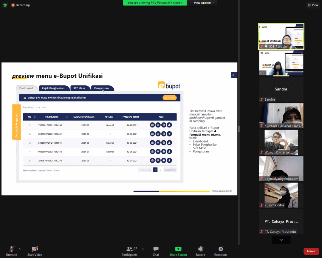 Kantor Pelayanan Pajak (KPP) Pratama Semarang Barat menyelenggarakan sosialisasi tentang e-Bukpot Unifikasi yang diikuti oleh 64 wajib pajak secara virtual melalui zoom meeting di Semarang (Rabu, 23/03).