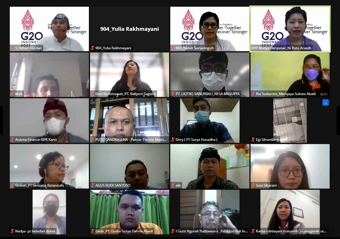 Kantor Pelayanan Pajak (KPP) Madya Denpasar kembali mengadakan kelas pajak dengan topik aturan turunan Undang–Undang Harmonisasi Peraturan Perpajakan (HPP) yang dihadiri oleh 71 Wajib Pajak Badan secara daring melalui kanal Zoom Meeting di Denpasar, Bali (Kamis, 23/06).