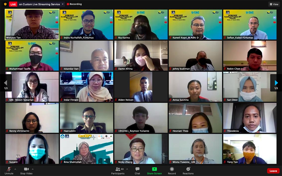 Tax Center Universitas Internasional Batam (UIB) bersama Kantor Wilayah Direktorat Jenderal Pajak Kepulauan Riau (Kanwil DJP Kepri) menggelar Workshop Pengisian Surat Pemberitahuan (SPT) Tahunan Wajib Pajak Orang Pribadi Karyawan melalui e-Filing secara daring melalui Zoom Cloud Meetings di Batam (Rabu, 17/3).