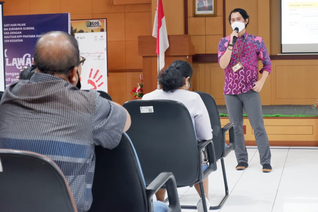 Kantor Pelayanan Pajak (KPP) Pratama Surabaya Gubeng (Selasa, 7/12) melaksanakan kegiatan Sosialisasi Undang-Undang Harmonisasi Peraturan Perpajakan (UU HPP) di Aula Lantai 4 KPP Pratama Surabaya Gubeng. Acara ini diikuti oleh 90 Wajib Pajak (WP) Prominen dan dilaksanakan secara tatap muka dengan mematuhi standar protokol kesehatan.