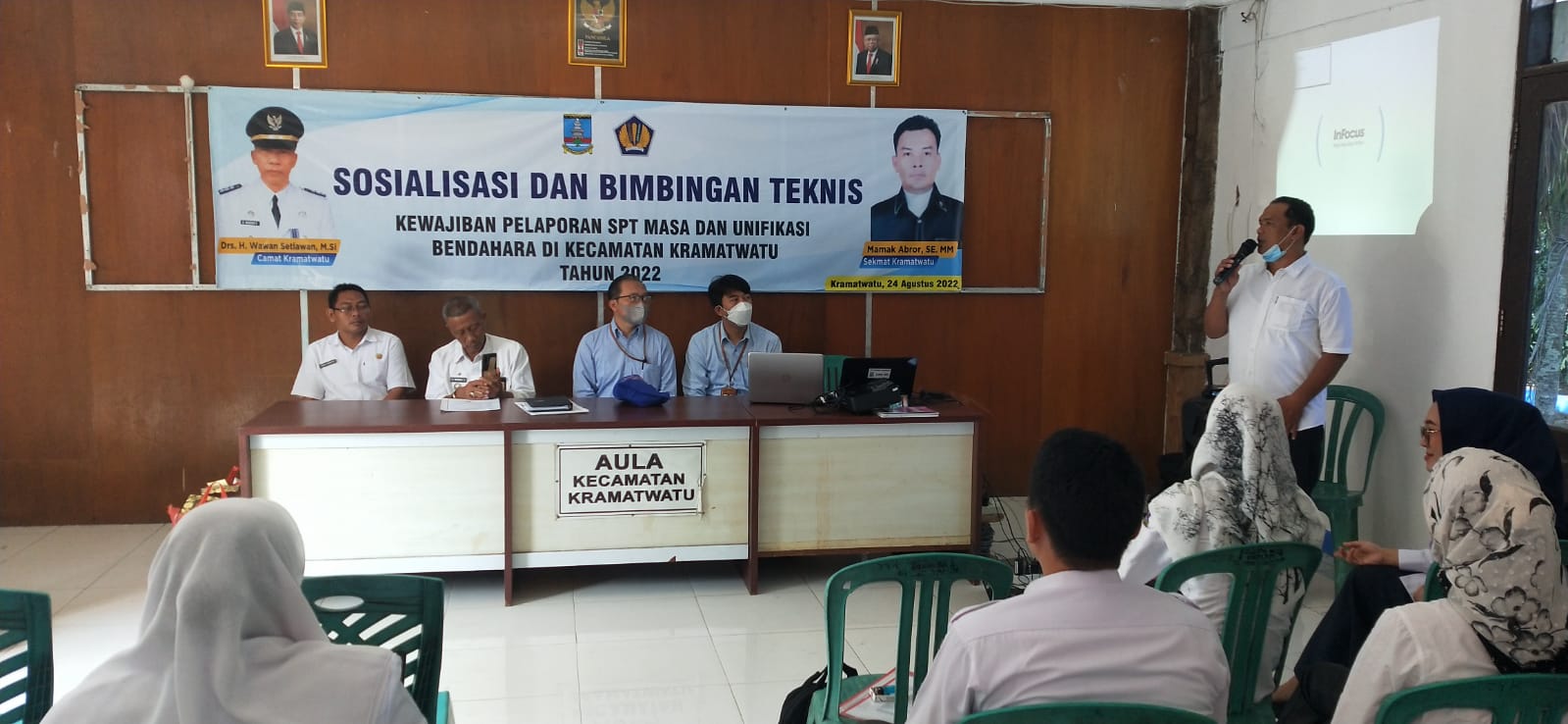 Kantor Pelayanan Pajak (KPP) Pratama Serang Timur mengadakan kegiatan bimbingan teknis (bimtek) pengisian dan pelaporan Surat Pemberitahuan (SPT) Masa dan e-Bupot unifikasi bagi bendahara desa dan kecamatan di lingkungan Kecamatan Kramatwatu yang bertempat di Aula Kantor Kecamatan Kramatwatu, Kabupaten Serang (Rabu, 24/8).