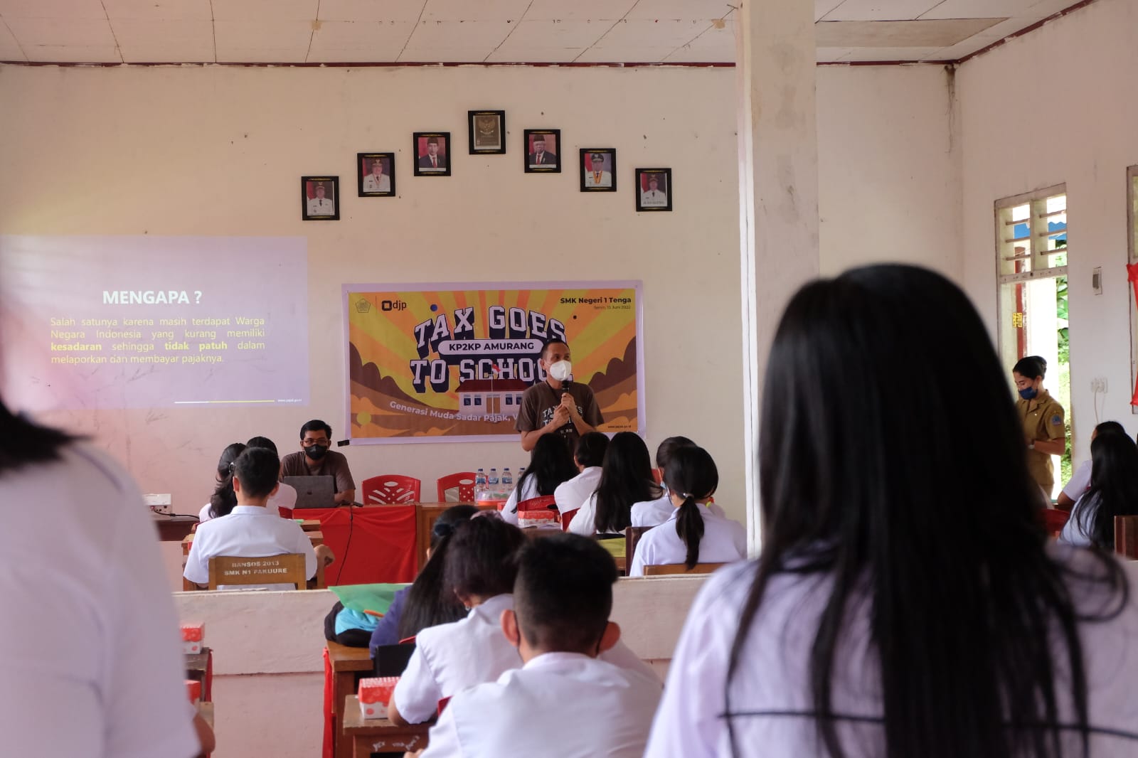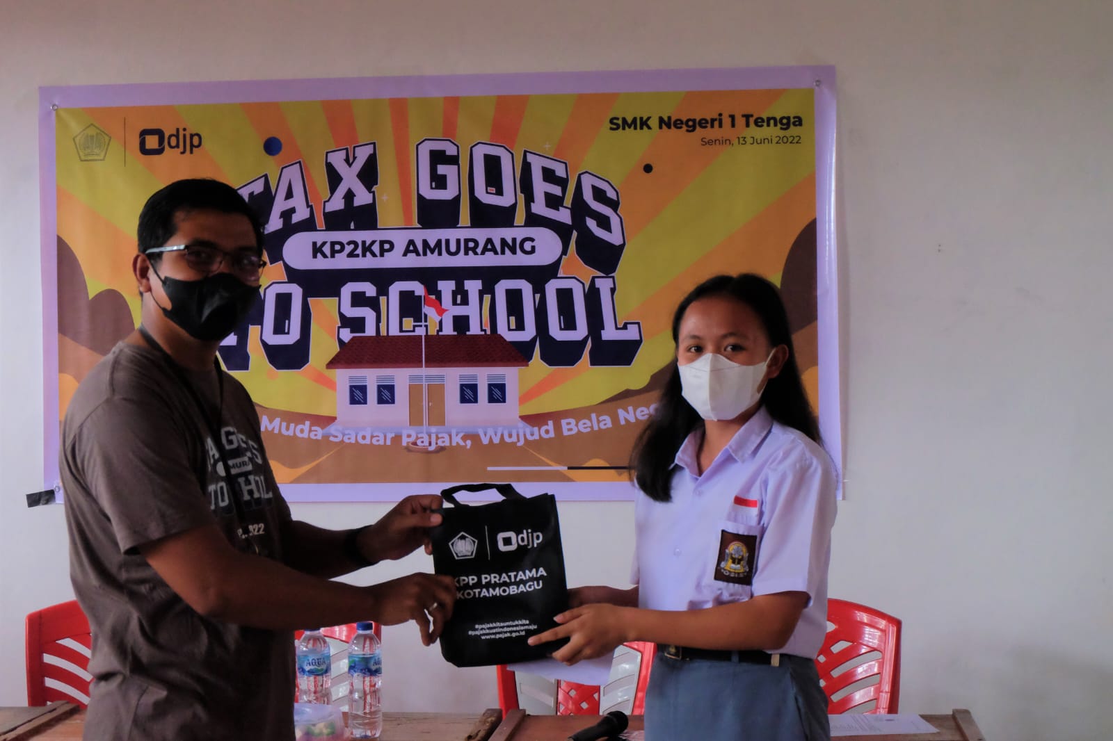 Kantor Pelayanan Penyuluhan dan Konsultasi Perpajakan (KP2KP) Amurang bersama Sekolah Menengah Kejuruan (SMK) Negeri 1 Tenga mengadakan kegiatan Tax Goes To School (TGTS) bertempat di SMK Negeri 1 Tenga, Kabupaten Minahasa Selatan (Senin, 13/6). Kegiatan ini mereka lakukan untuk mengenalkan pajak kepada siswa-siswi SMK Negeri 1 Tenga sehingga tumbuh kesadaran pajak.