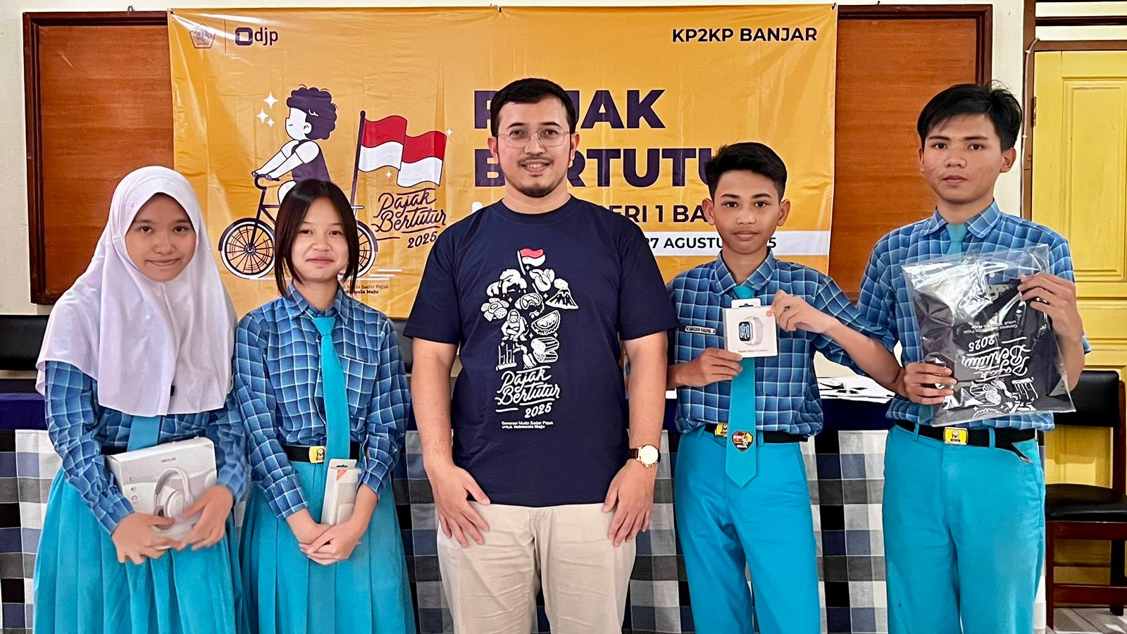 Wakil Kepala Sekolah Bidang Kurikulum SMP Negeri 1 Banjar, Pujiadi, menyampaikan ucapan terima kasih dan kepada tim dari KP2KP Banjar dan KPP Pratama Ciamis yang telah menyelenggarakan kegiatan Pajak Bertutur 2025.