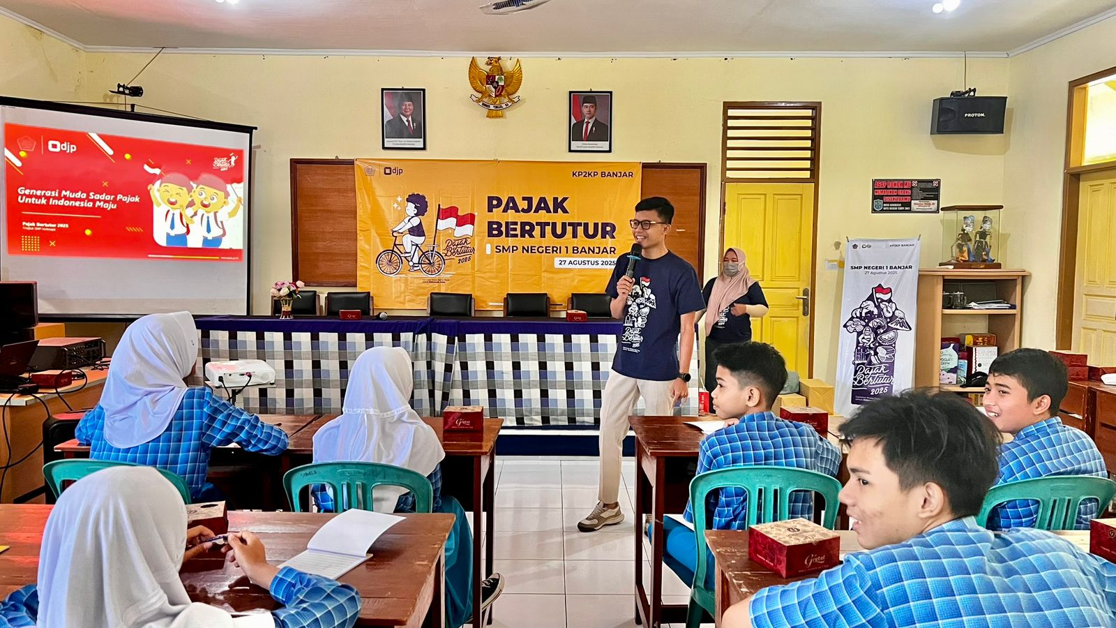 Kantor Pelayanan, Penyuluhan, dan Konsultasi Perpajakan (KP2KP) Banjar dan Kantor Pelayanan Pajak (KPP) Pratama Ciamis menyelenggarakan kegiatan Pajak Bertutur yang mengangkat tema “Generasi Muda Sadar Pajak Untuk Indonesia Maju” di SMP Negeri 1 Banjar, Kota Banjar (Rabu, 27/8).