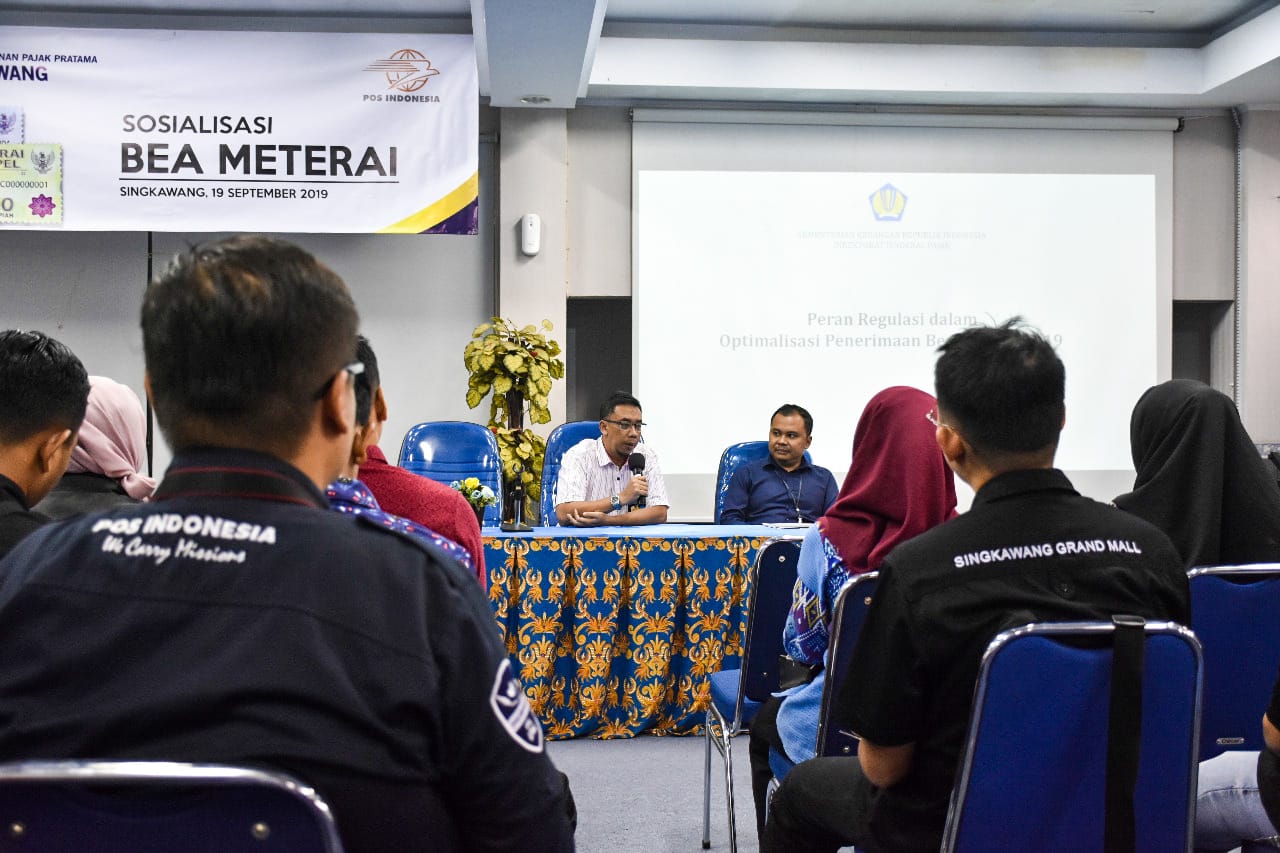 Kepala Seksi Pengawasan dan Konsultasi I Berman Paulus Marpaung dan Kepala Kantor Pos Kota Singkawang Yosia menyampaikan materi sosialisasi. Pada sosialisasi bea meterai ini, Yosia menjelaskan bahwa kantor pos menyediakan layanan pick up meterai dimana konsumen dapat dengan mudah mendapatkan meterai tempel hanya dengan menghubungi layanan kantor pos, memberitahu berapa banyak meterai yang dibutuhkan, dan meterai akan diantarkan langsung oleh petugas pos.