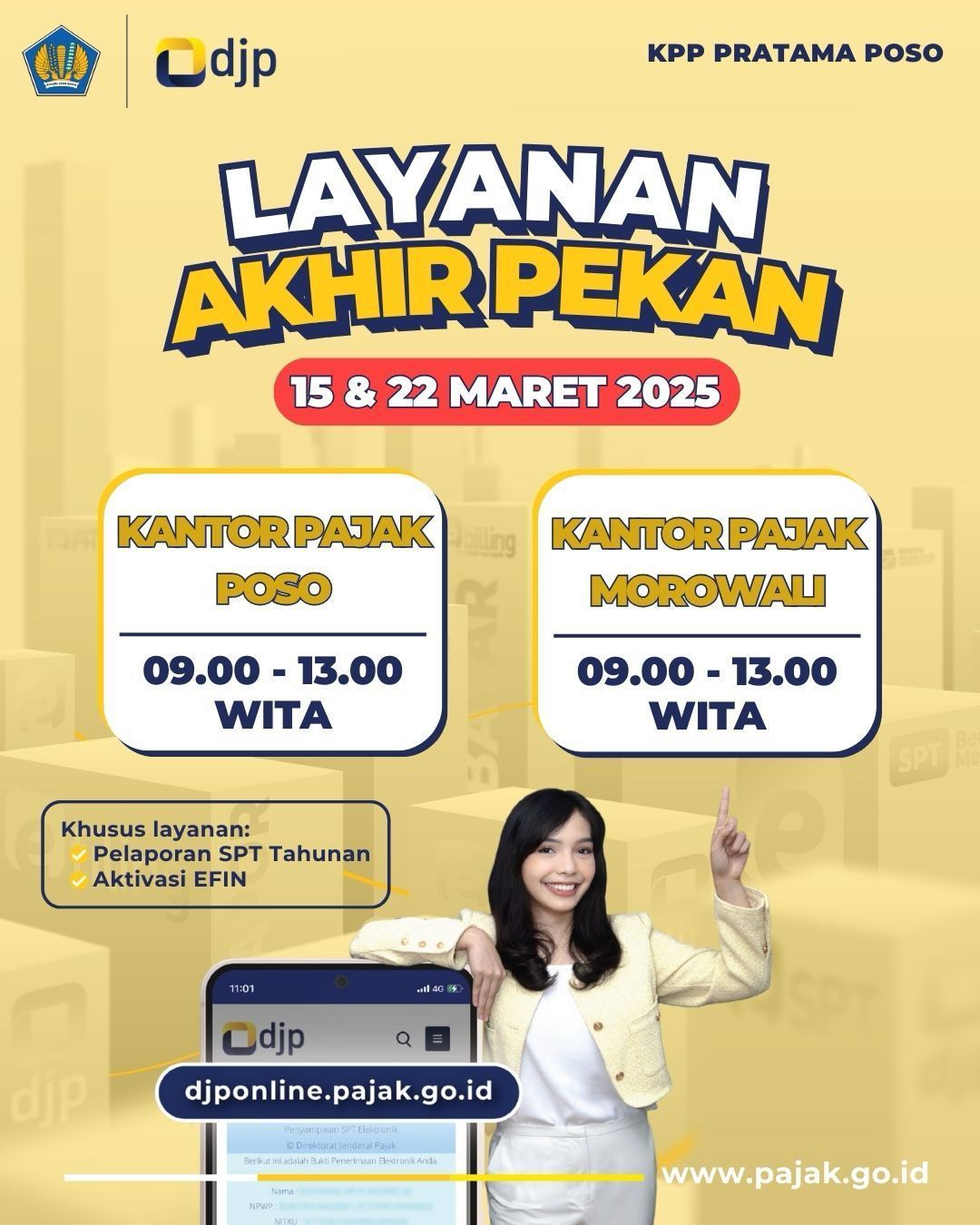 Kantor Pelayanan Pajak (KPP) Pratama Poso memperluas jangkauan pelayanan kepada masyarakat dengan membuka jam pelayanan di luar jam kerja khusus untuk asistensi pelaporan SPT Tahunan. Layanan ini dibuka di KPP Pratama Poso, Bungku Tengah, Kabupaten Morowali, Sulawesi Tengah (Sabtu, 22/3).