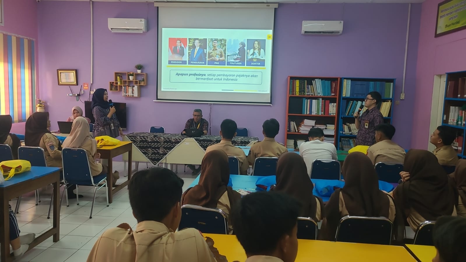Ariyanto, Yuli Irnayanti, dan Ganjar Catur Rahmawan, Penyuluh Pajak KPP Pratama Wonosari, didampingi tim menggelar acara Tax Goes To School bersama dengan 42 siswa di Ruang Perpustakaan SMA Negeri 2 Playen, Jalan Jogja-Wonosari, Logandeng, Playen, Kabupaten Gunungkidul (Jumat, 1/8).