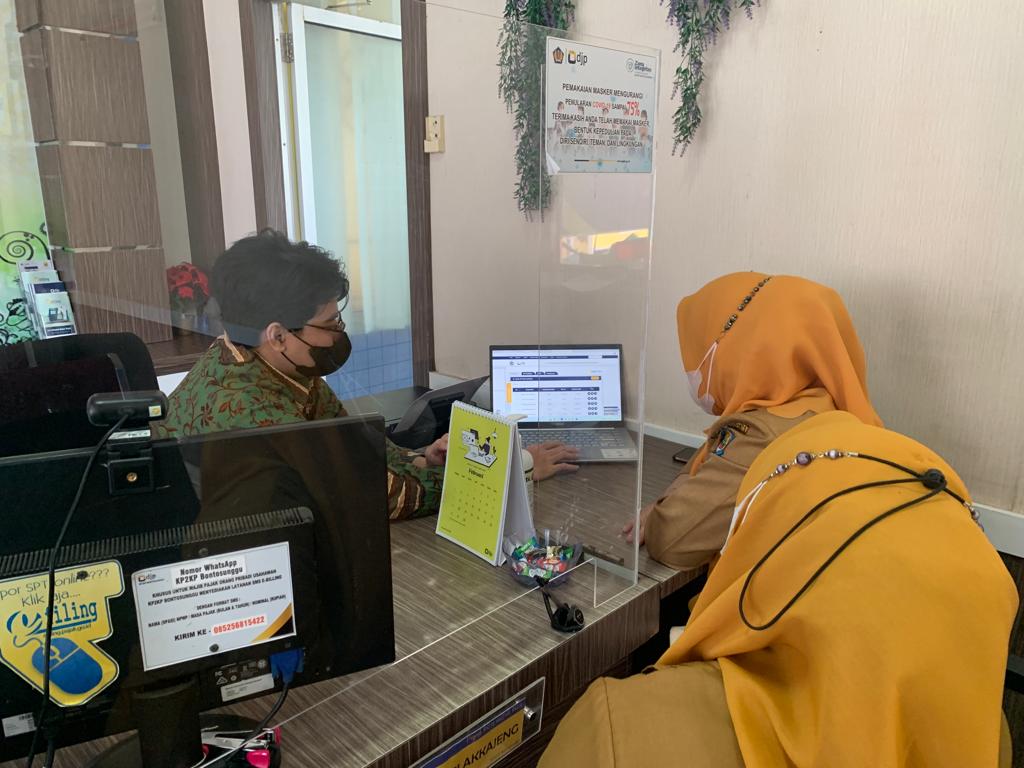 Kantor Pelayanan, Penyuluhan, dan Konsultasi Perpajakan (KP2KP) Bontosunggu menerima kedatangan wajib pajak yang mengalami kendala pelaporan Surat Pemberitahuan (SPT) Masa melalui aplikasi e-Bupot di Tempat Pelayanan Terpadu (TPT) KP2KP Bontosunggu (Selasa, 17/1).