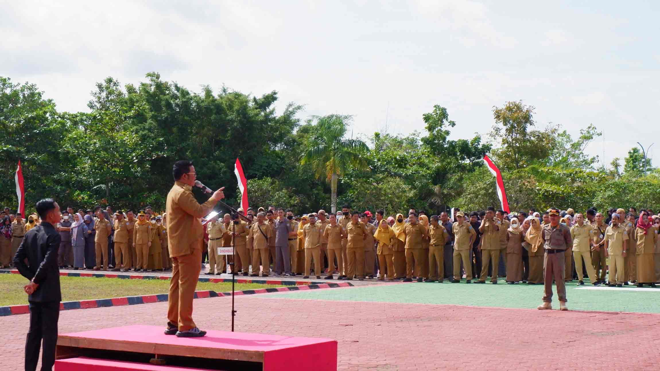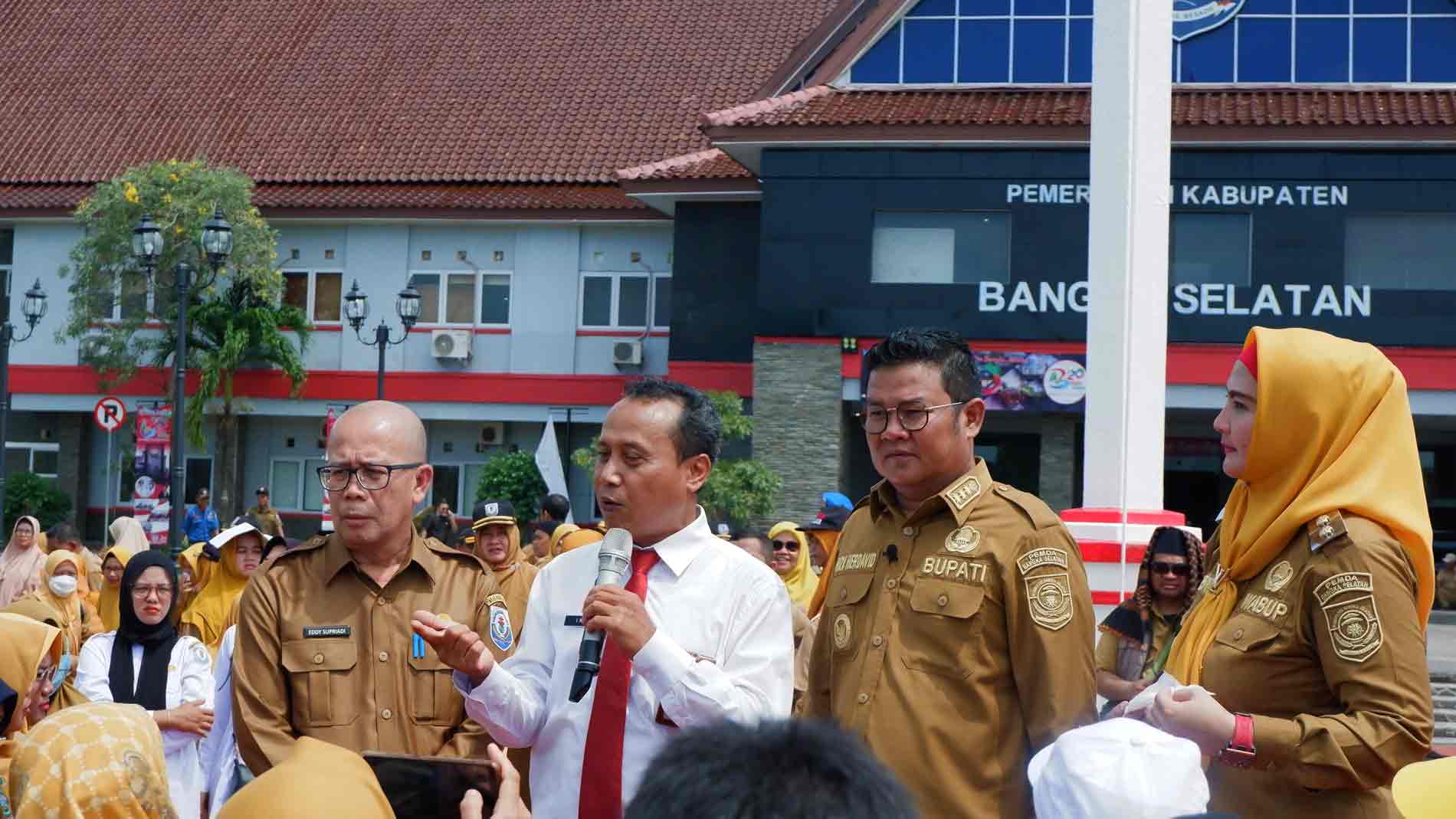 Dalam pidatonya, Bupati Bangka Selatan Riza Herdavid memaparkan prestasi yang dicapai oleh Pemda Kabupaten Bangka Selatan sekaligus mengimbau kepada seluruh ASN untuk menyukseskan program pemerintah yang sedang melakukan integrasi data wajib pajak melalui pemadanan NIK menjadi NPWP.