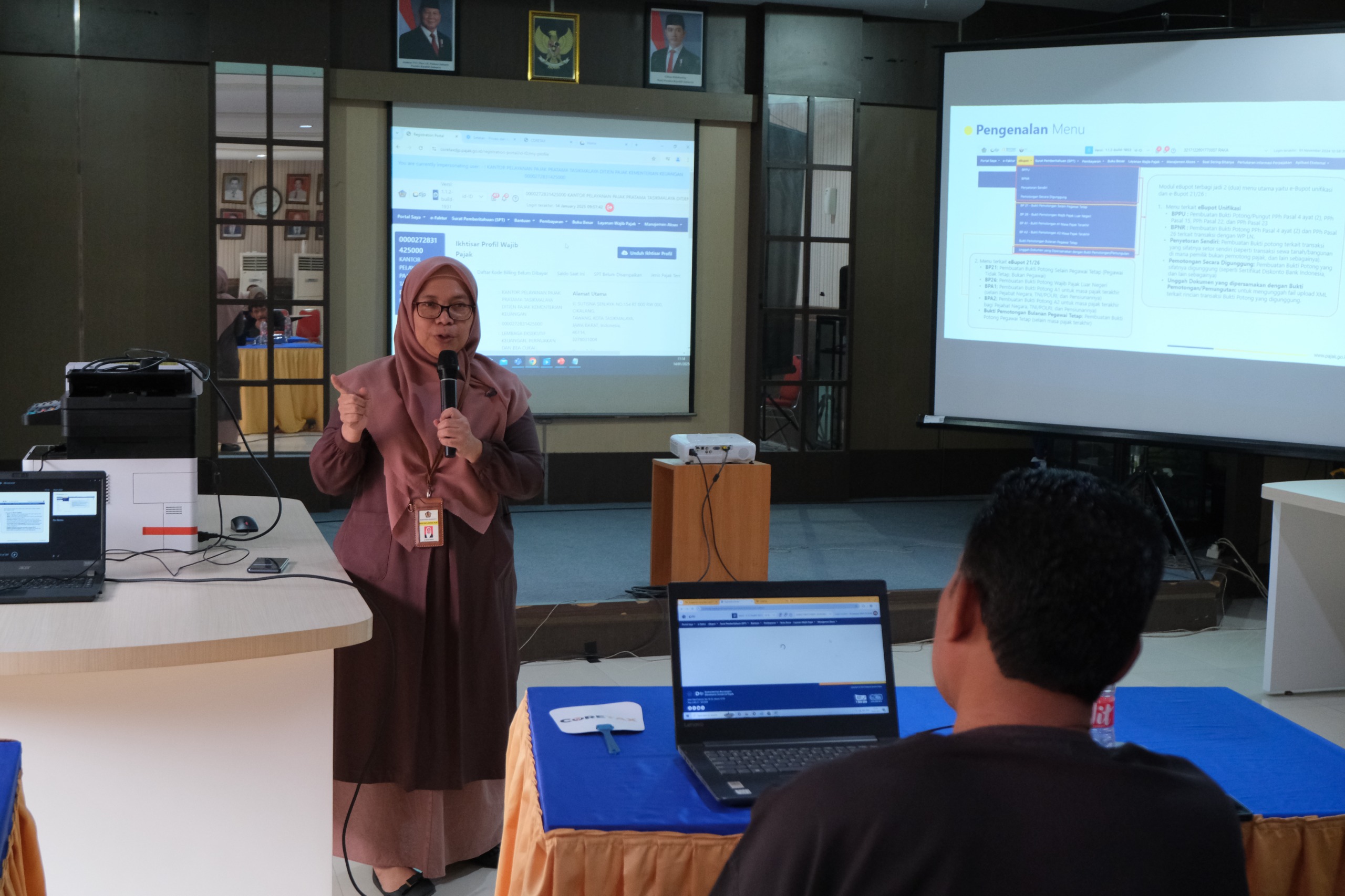 Tim Penyuluh Pajak KPP Pratama Tasikmalaya memandu perwakilan kecamatan yang hadir mengenai aplikasi Coretax DJP, dimulai dari aktivasi akun Coretax DJP, login ke aplikasi Coretax DJP, proses verifikasi wajah, hingga bagaimana menggunakan fitur-fitur yang tersedia seperti pembuatan e-Bupot, Deposit Pajak, Kode Billing, dan SPT Masa Unifikasi per jenis pajak.