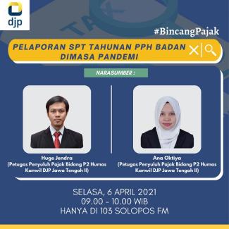 Tim Penyuluh Kanwil DJP Jawa Tengah II bekerja sama dengan Solopos kembali menggelar Bincang Pajak dari studio Solopos FM103 Surakarta (Selasa, 6/4). Tema Bincang Pajak kali ini adalah Pelaporan SPT Badan di Masa Pandemi. Bertindak sebagai narasumber adalah Ana Oktiya dan Huge Jendra Yuningrat, pelaksana dari Bidang P2HUmas Kanwil DJP Jawa Tengah II.
