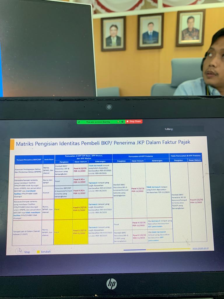 Dengan adanya peraturan baru terkait faktur pajak, Kantor Pelayanan Pajak (KPP) Madya Jakarta Barat mengadakan sosialisasi dengan materi Peraturan Direktur Jenderal Pajak nomor PER-11/PJ/2022 tentang Perubahan atas Peraturan Direktur Jenderal Pajak Nomor PER-03/PJ/2022 tentang Faktur Pajak secara daring melalui Zoom Cloud Meeting di ruang rapat lantai 11 KPP Madya Jakarta Barat, Jalan M.I. Ridwan Rais, Jakarta (Rabu, 24/8).