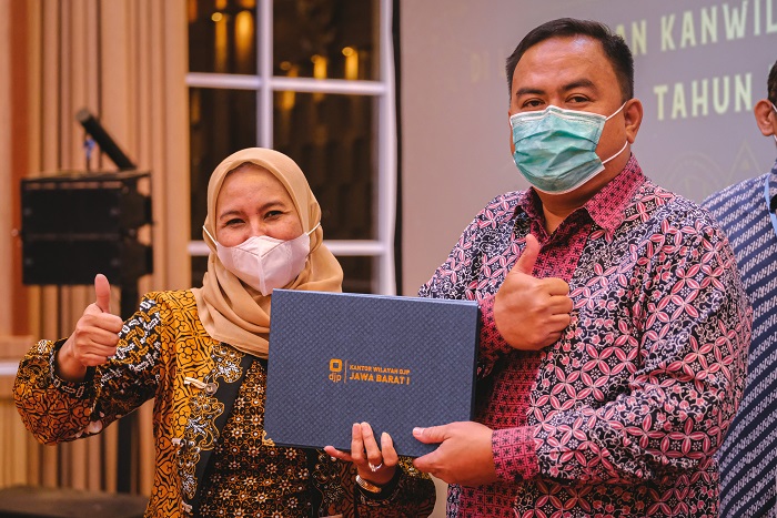 Kepala KPP Pratama Cianjur Rudi Munandar menerima penghargaan yang diberikan secara langsung oleh Kepala Kanwil DJP Jawa Barat I Erna Sulistyowati.