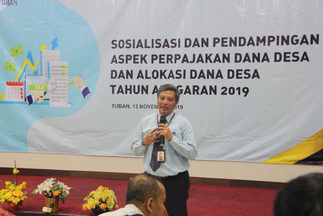 KPP Pratama Tuban telah menyelenggarakan kegiatan sosialisasi dan pendampingan aspek perpajakan Dana Desa (DD) dan Alokasi Dana Desa (ADD) Tahun Anggaran 2019 gelombang pertama (Rabu, 13/11). Acara yang berlangsung di Aula KPP Pratama Tuban ini mengundang 53 bendahara desa dari empat kecamatan dengan dibagi menjadi dua sesi. Sesi pertama untuk Kecamatan Tuban dan Kecamatan Semanding, dilanjutkan sesi kedua untuk Kecamatan Jenu dan Kecamatan Plumpang.
