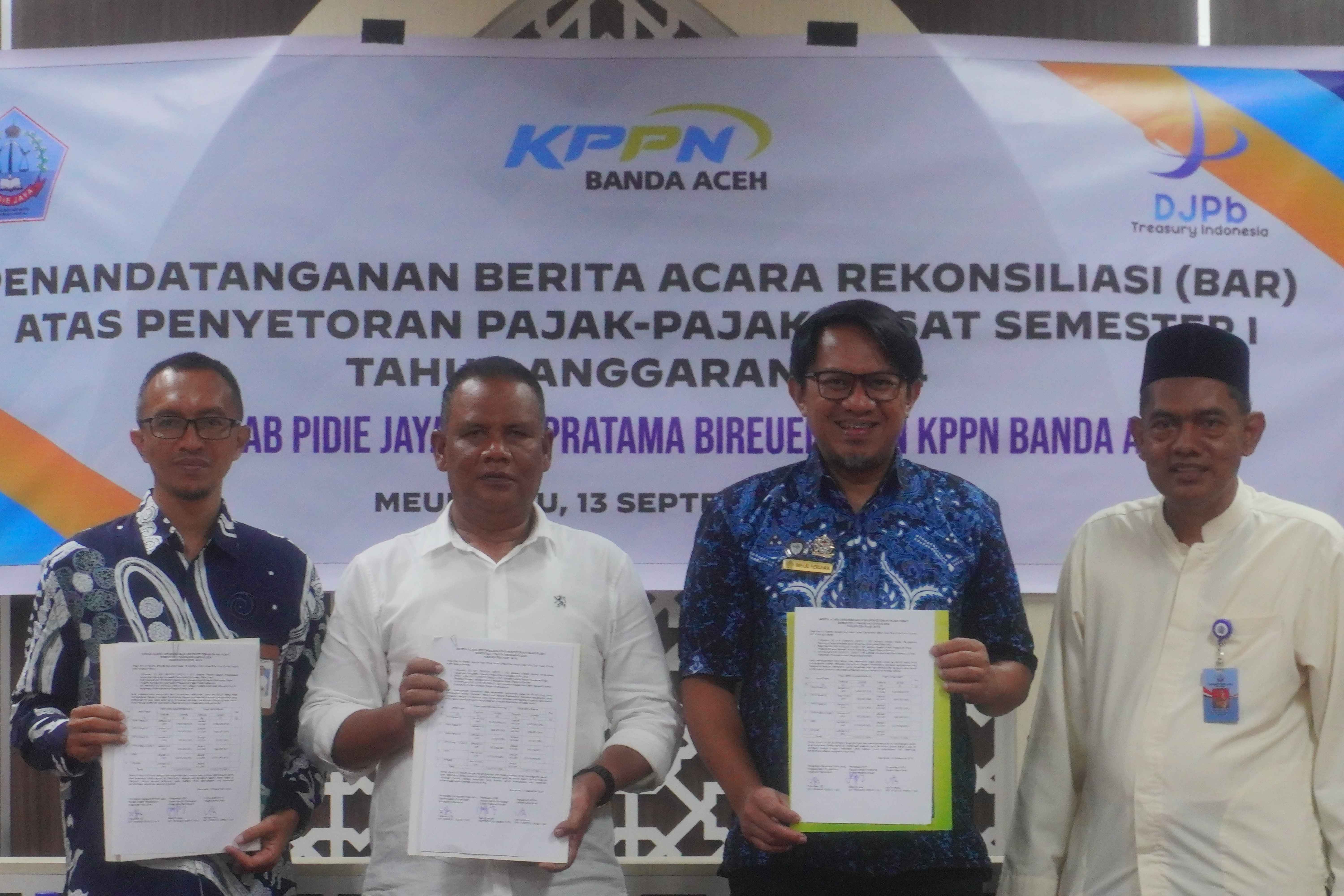 Rekonsiliasi ini dihadiri oleh Kepala KPP Pratama Bireuen Melki Ferdian, Kepala Seksi Bank sebagai perwakilan Kantor Pelayanan Perbendaharaan Negara (KPPN) Banda Aceh Arif Hermanu, dan Kepala Badan Pengelolaan Keuangan Kabupaten (BPKK) Pidie Jaya T Muslem.