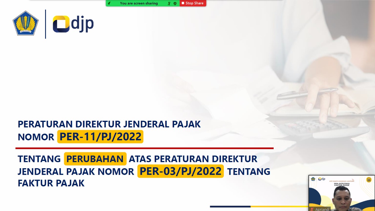 Diselenggarakan melalui Zoom Meeting webinar, kelas pajak dimulai pada pukul 09.00 WIB. “Tujuan dari PER-11/PJ/2022 ini adalah untuk memberikan kemudahan bagi Pengusaha Kena Pajak dalam membuat Faktur Pajak, serta memberikan kepastian hukum dan keadilan dalam pengkreditan PPN yang tercantum dalam Faktur Pajak,” jelas Apriandi yang merupakan narasumber dalam kelas pajak. Sebelum masuk ke penjelasan isi, Apriandi juga menjelaskan mengenai mengapa perlunya dilakukan penyesuaian melalui PER-11/PJ/2022 ini.