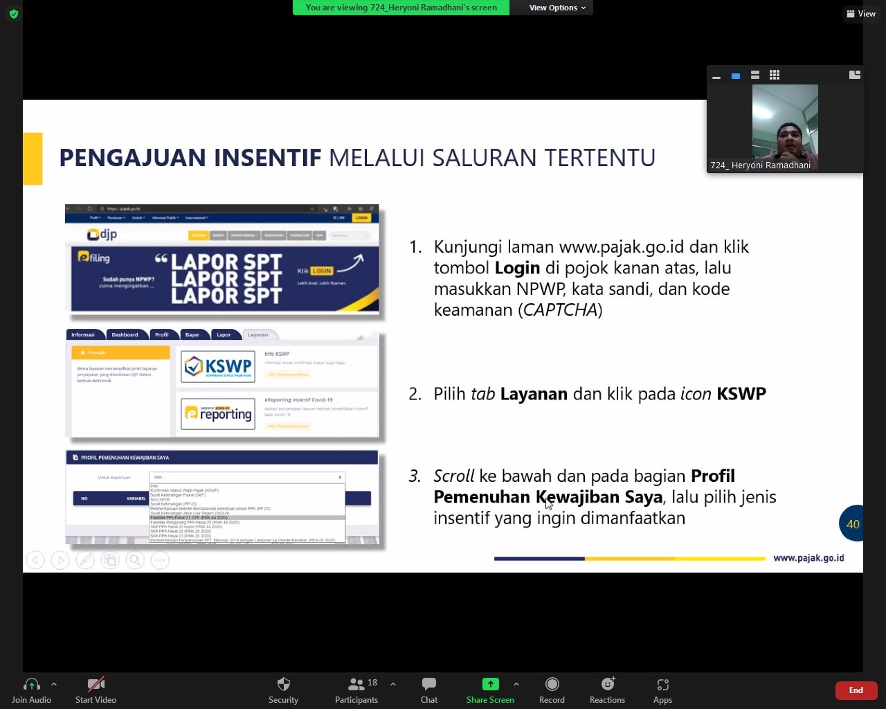 "Pembaharuan tersebut terdapat pada pemberian Insentif terkait Pajak Penghasilan (PPh) Pasal 21 Ditanggung Pemerintah (DTP), PPh Final Usaha Mikro, Kecil, dan Menengah (UMKM) DTP, Pajak Pertambahan Nilai (PPN) sebagai Pengusaha Kena Pajak (PKP) berisiko rendah bagi WP yang menyampaikan Surat Pemberitahuan (SPT) Masa PPN lebih bayar restitusi paling banyak 5 miliar," ucap Heryoni, Fungsional Penyuluh KPP Pratama Bontang yang menjadi narasumber.