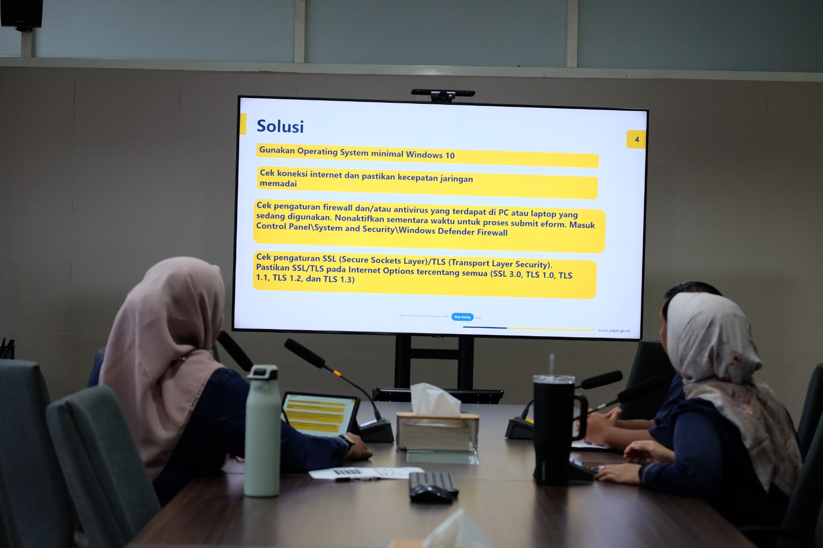 Atas kendala tersebut, narasumber menyampaikan solusi yang dapat dicoba, seperti menggunakan Operating System minimal Windows 10, memastikan koneksi internet dan kecepatan jaringan, memastikan pengaturan firewall dan antivirus, dan memastikan pengaturan SSL (Secure Sockets Layer) atau TLS (Transport Layer Security).