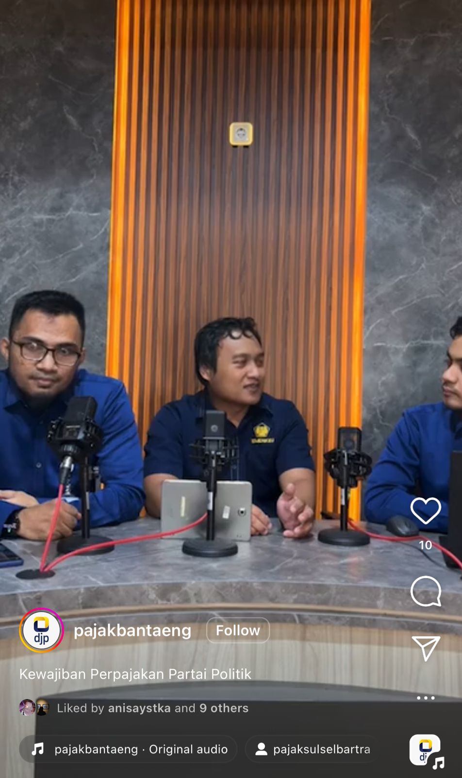 Kantor Pelayanan Pajak (KPP) Pratama Bantaeng melaksanakan kegiatan edukasi perpajakan terkait Kewajiban Perpajakan Partai Politik melalui fitur siaran langsung pada aplikasi Instagram. Tim Penyuluh Pajak KPP Pratama Bantaeng memandu langsung jalannya acara dari Ruang Podcast KPP Pratama Bantaeng, Kabupaten Bantaeng (Rabu, 29/11).