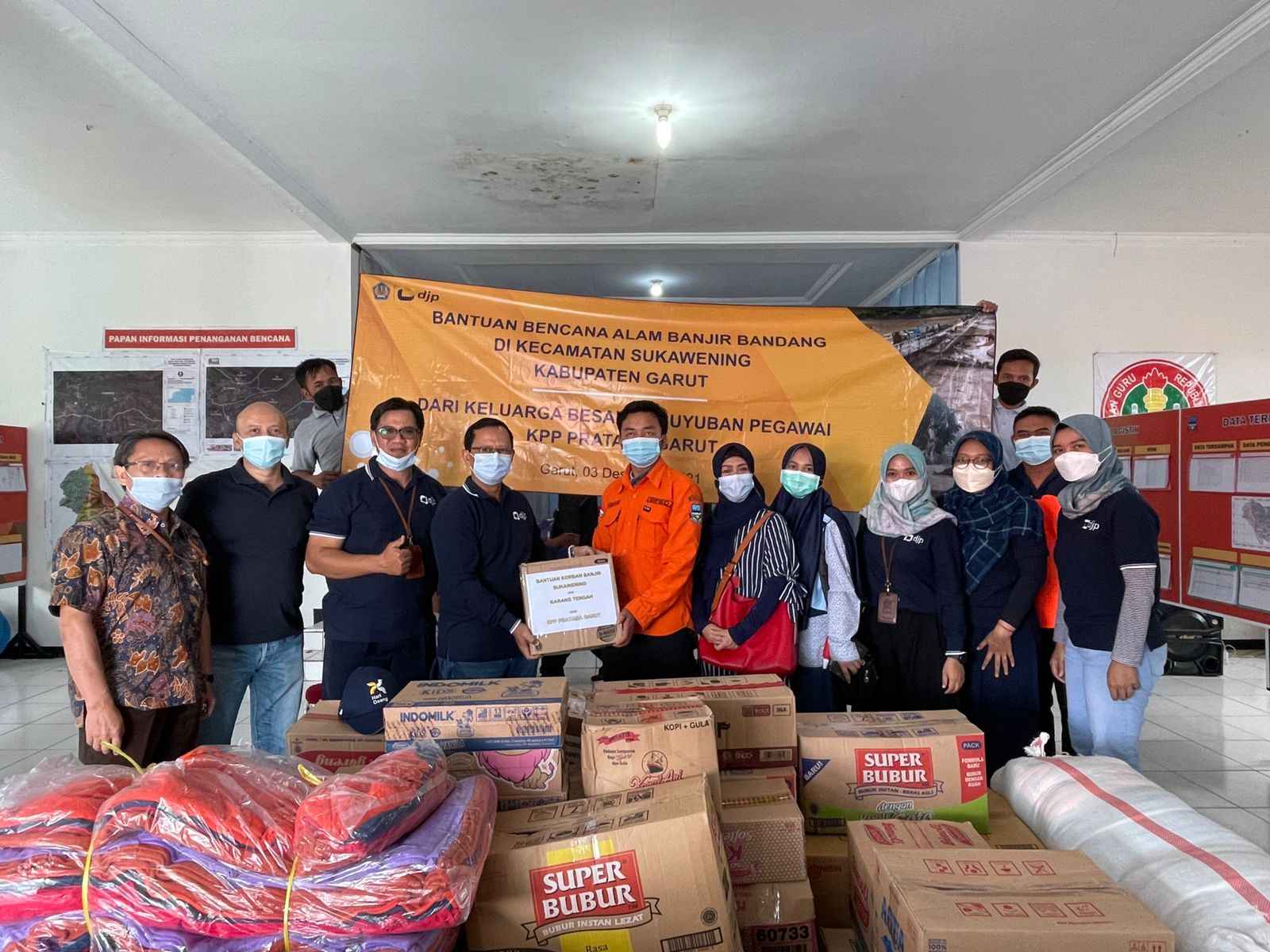 Bantuan yang berasal dari Paguyuban KPP Pratama Garut dan Dharma Wanita Persatuan (DWP) Kanwil DJP Jawa Barat I ini berupa sembako, makanan bayi, selimut, sarung, peralatan mandi hingga kebutuhan pendukung seperti alat tulis kantor.