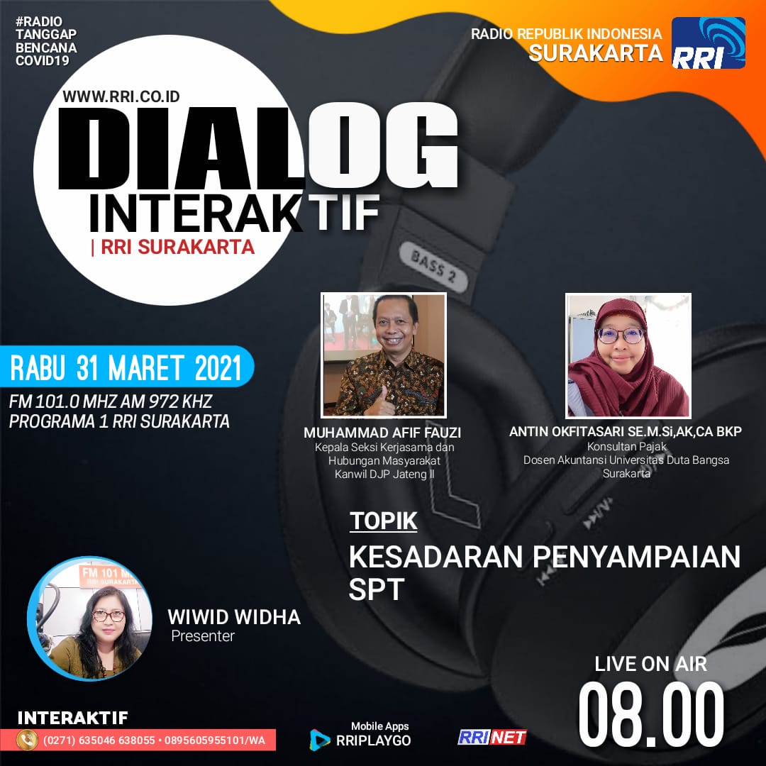 Dialog Interaktif berlangsung selama satu jam saat prime time mulai pukul 08.00 sampai 09.00 pagi dan dipandu oleh Wiwid Widha sebagai penyiar RRI Surakarta. Mewakili Kanwil DJP Jawa Tengah II, Muhammad Afif Fauzi selakuKepala Seksi Kerja Sama dan Hubungan Masyarakat pada sesi pertama menjelaskan tata-cara pelaporan SPT Tahunan PPh Orang Pribadi melalui e-Filing di situs DJP Online. Narasumber kedua adalah Antin Okfitasari, konsultan pajak dan dosen Universitas Duta Bangsa Surakarta.