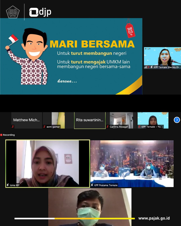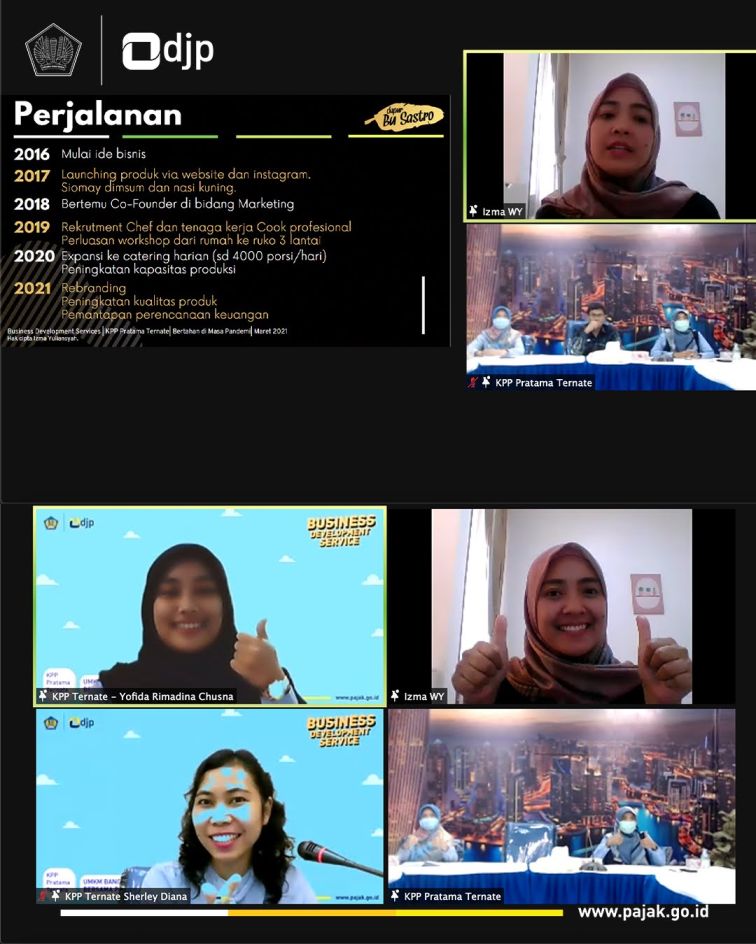 Dalam Business Development Service kali ini, KPP Pratama Ternate menghadirkan Izma Yuliansyah selaku pemilik dan pendiri usaha Dapur Bu Sastro untuk berbagi kepada pelaku Usaha Mikro, Kecil dan Menengah (UMKM) di Maluku Utara. Selain berbagi tips agar usaha dapat bertahan di kala pandemi, Izma juga berbagi tips mengelola keuangan yang baik dan memberikan ajakan untuk taat akan kewajiban perpajakan bagi pelaku usaha.