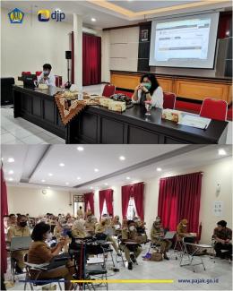 Achmad dan Rizkiana mempraktikkan simulasi perekaman e-Bupot Unifikasi, perekaman Nomor Transaksi Penerimaan Negara (NTPN) atau nomor Surat Perintah Pencairan Dana (SP2D), hingga pelaporan SPT Masa Unifikasi. Bendahara mengikuti penjelasan dan langsung mempraktikkan menggunakan komputer jinjing masing-masing.