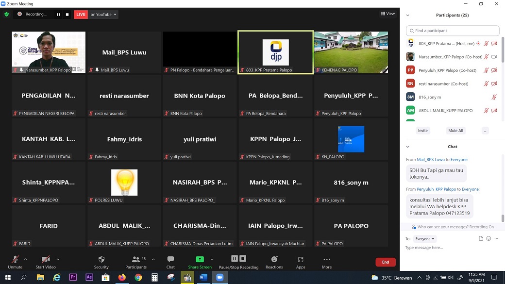 Kantor Pelayanan Pajak (KPP) Pratama Palopo menyelenggarakan kegiatan edukasi perpajakan tentang e-Bupot Unifikasi PPh Pasal 21 untuk bendahara pemerintah (Kamis, 9/9). Kegiatan yang diikuti oleh perwakilan 25 instansi vertikal se-Kota Palopo dan Kabupaten Luwu ini dilangsungkan secara daring dari ruang rapat KPP Pratama Palopo, Kota Palopo.