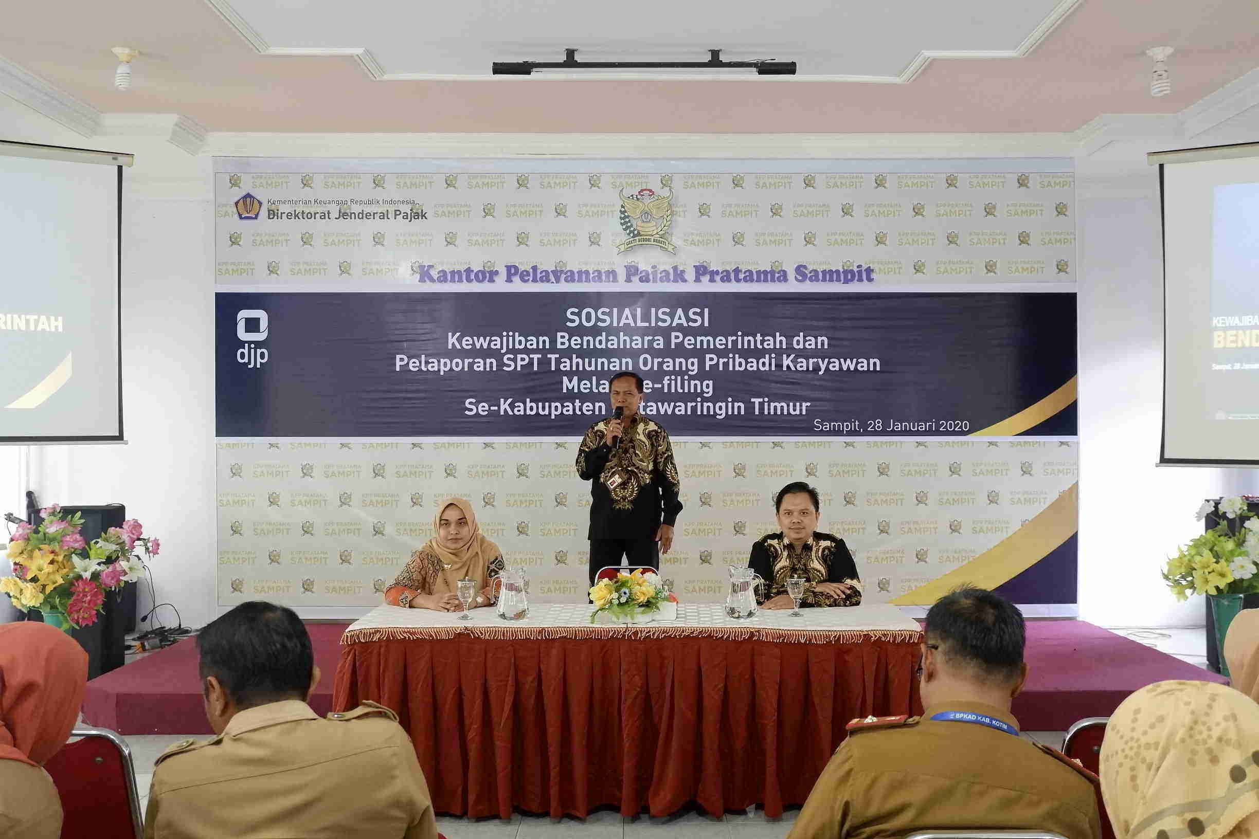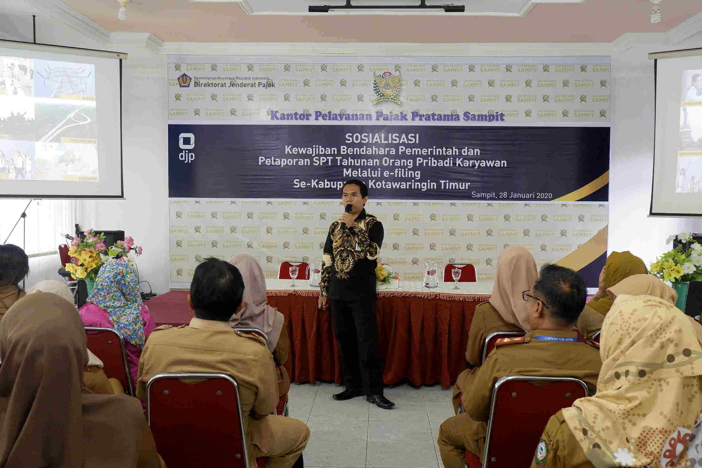 KPP Pratama Sampit mengadakan acara Sosialisasi Kewajiban Bendahara Pemerintah dan Pelaporan SPT Tahunan Orang Pribadi Karyawan melalui e-Filing se-Kabupaten Kotawaringin Timur, bertempat di aula KPP Pratama Sampit (Selasa, 28/1).