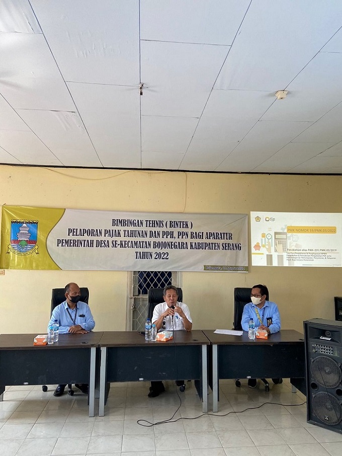 Untuk memenuhi undangan narasumber bimbingan teknis dan meningkatkan pengetahuan masyarakat mengenai pelaporan SPT Masa Unifikasi di Kecamatan Bojonegara, KPP Pratama Serang Timur melakukan sosialisasi dan bimbingan teknis pelaporan SPT Masa Unifikasi di Kecamatan Bojonegara. Rangkaian kegiatan dimulai dari sambutan Camat Bojonegara sampai pada kegiatan asistensi yang dilakukan oleh Account Representative dan Fungsional Penyuluh KPP Pratama Serang Timur kepada seluruh bendahara desa di lingkungan Kecamatan Bojonegara.