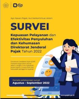 Kegiatan Survei Kepuasan Pelayanan dan Efektifitas Penyuluhan dan Kehumasan tersebut akan dilaksanakan pada tanggal 1 Agustus sampai dengan 9 September 2022. DJP menjamin setiap informasi dan keterangan yang diberikan oleh wajib pajak yang bersifat rahasia dan semata-mata hanya digunakan untuk kepentingan survei tersebut.