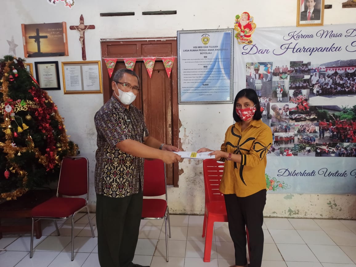Dalam rangka memperingati hari Natal 2020, Persekutuan Oikumene Kanwil DJP Jawa Tengah II mengadakan bakti sosial (baksos) ke Panti Asuhan Rumah Peduli Anugerah Ngaduman RT 02 RW 08, Area Sawah/Kebun, Mojosongo, Kecamatan Mojosongo, Kabupaten Boyolali, Jawa Tengah (Jumat, 8/1). Perwakilan Persekutuan Oikumene Kanwil DJP Jawa Tengah II Petrus Nolascus Suryaka menyerahkan donasi kepada pengurus Panti Asuhan Rumah Peduli Anugerah.