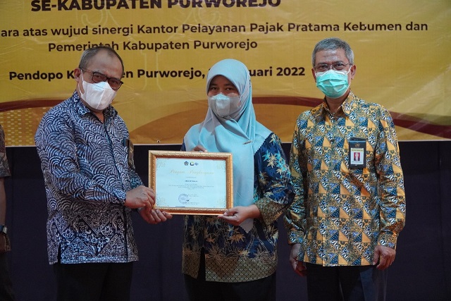 Kepala Kantor Wilayah (Kanwil) DJP Jawa Tengah II Slamet Sutantyo berkesempatan memberi penghargaan kepada sejumlah bendahara desa pada Kabupaten Purworejo di Pendopo Kabupaten Purworejo (Selasa, 25/1).