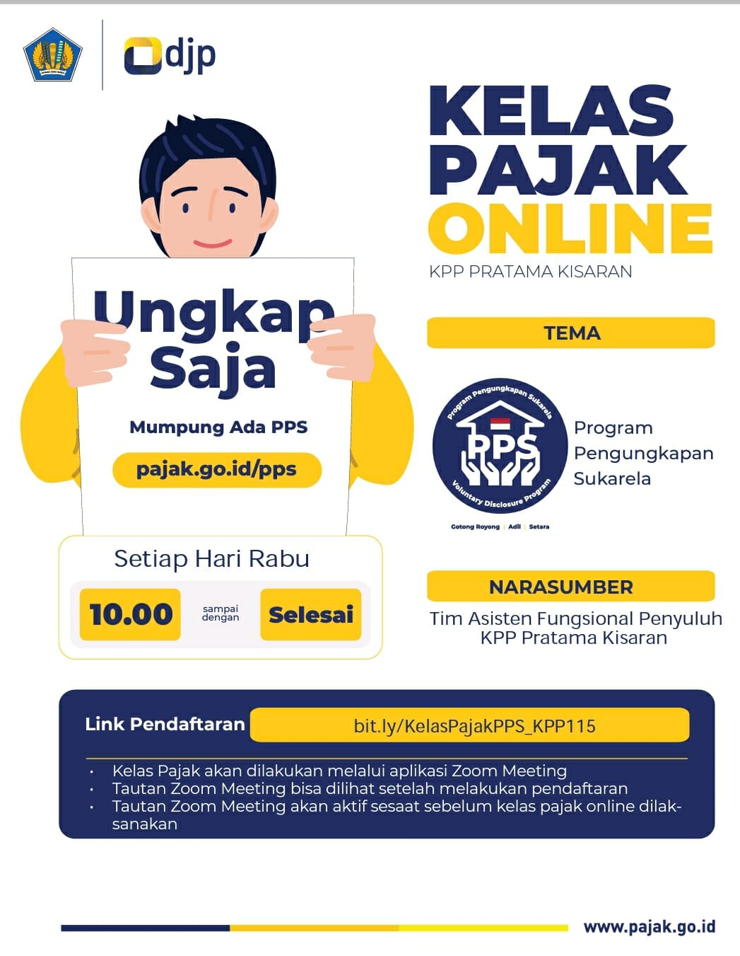 Indah menyampaikan bahwa untuk mengikuti kelas pajak tersebut, wajib pajak dapat melakukan pendaftaran melalui tautan bit.ly/KelasPajakPPS_KPP115. “Tautan Zoom Meeting akan dapat dilihat setelah melakukan pendaftaran,” jelas Indah.