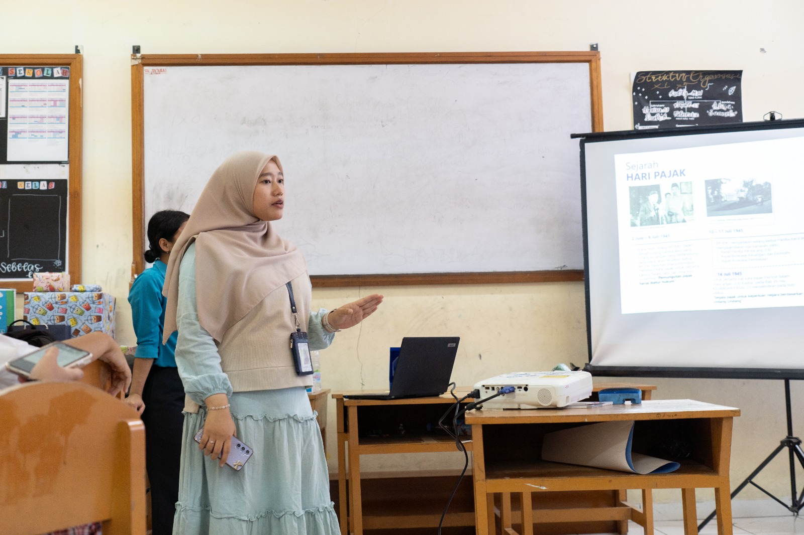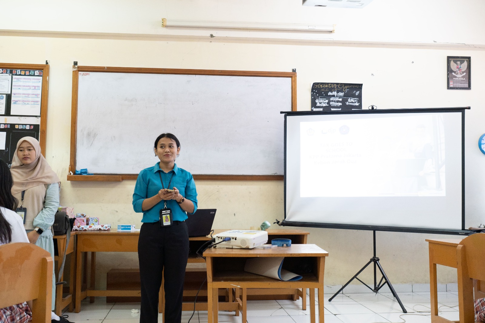 Kemudian, kegiatan tersebut dilanjutkan dengan pemaparan materi dari salah satu pegawai KPP Pratama Jakarta Kebon Jeruk Dua Fitria Febrianti tentang pajak, manfaat pajak, dan peran serta pelajar dalam membela negara. Di sela-sela penyampaian materi, Fitria juga mengadakan sesi tanya jawab dan memberikan doorprize kepada peserta yang aktif bertanya dan menjawab pertanyaan.