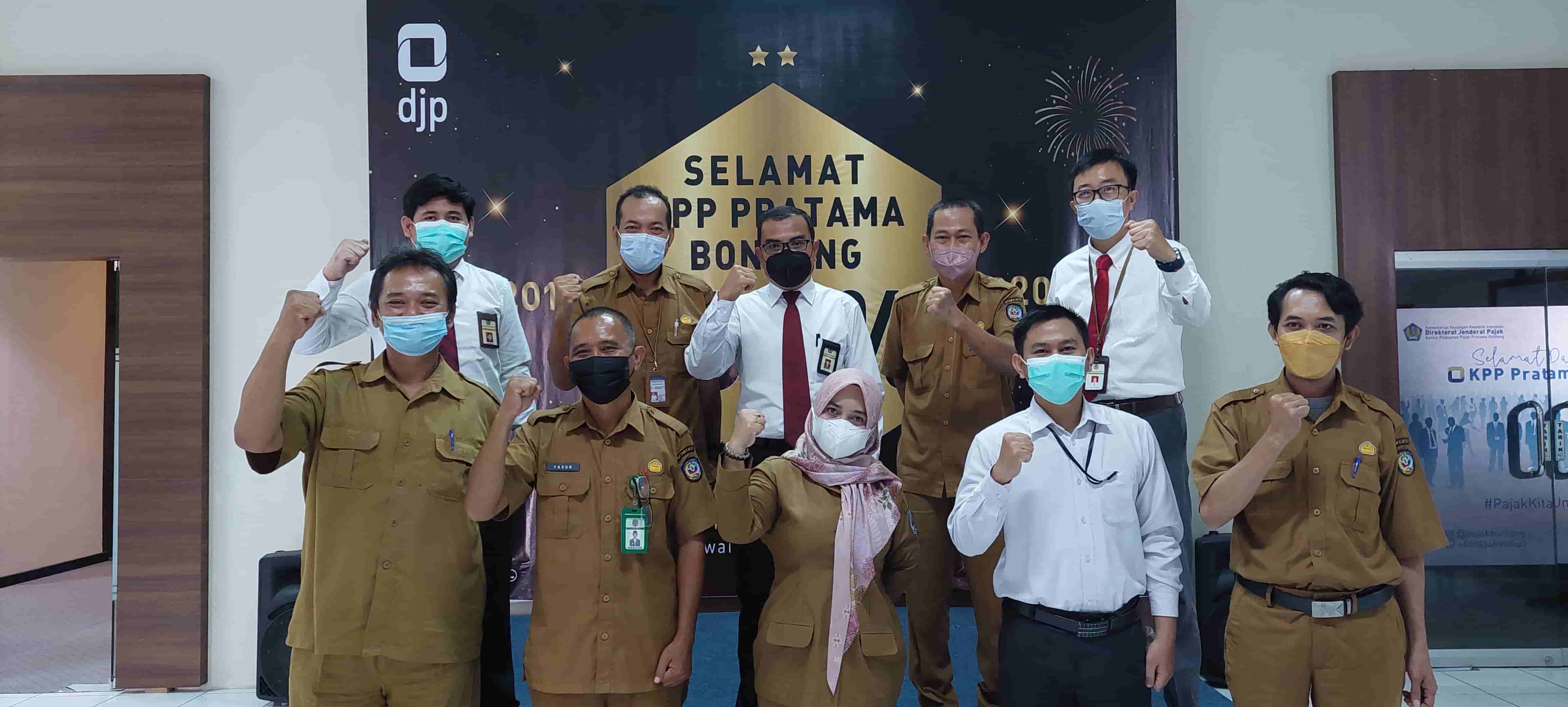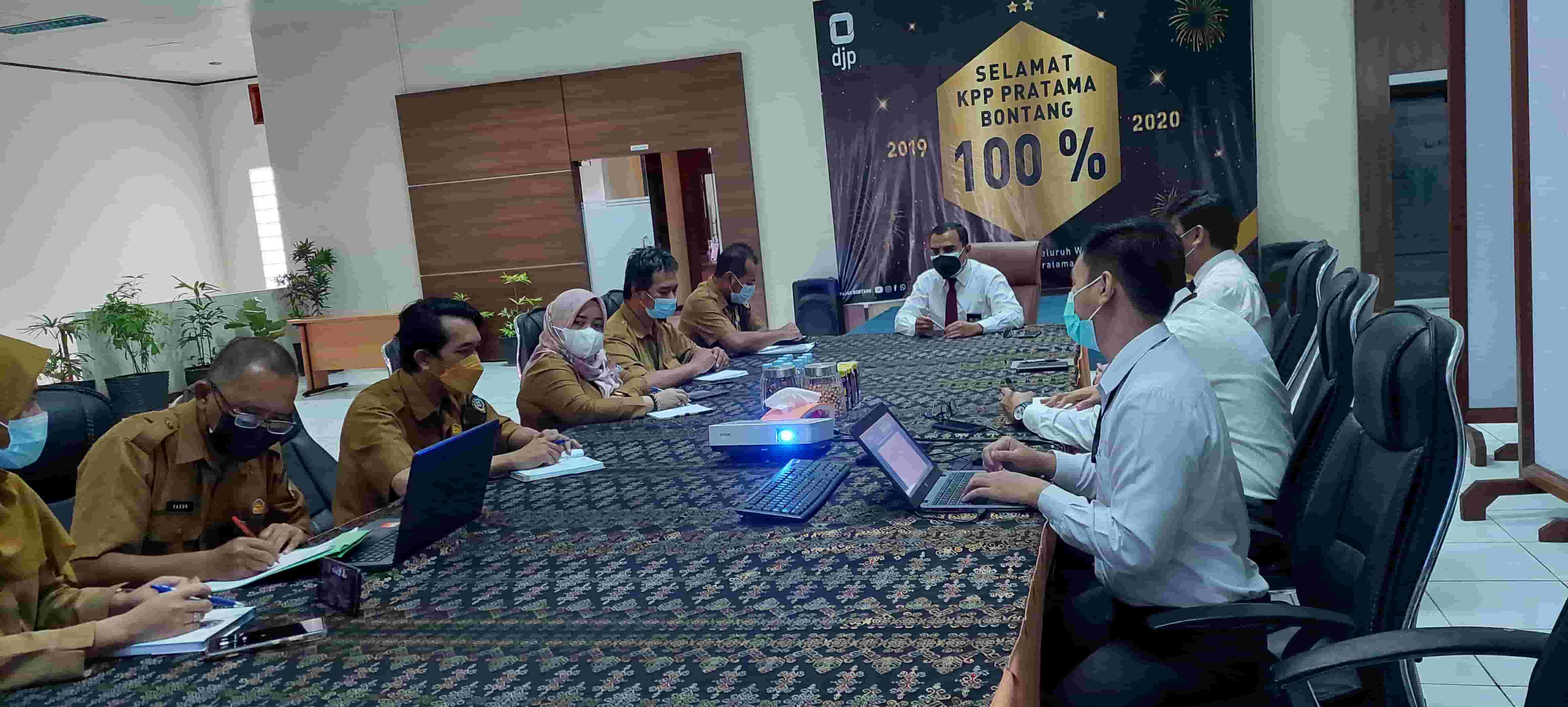 Kepala Kantor Pelayanan Pajak (KPP) Pratama Bontang Hanis Purwanto memimpin jalannya rapat Koordinasi dan Verifikasi Penyajian Data PBB P2 atas laporan Hasil Pemeriksaan BPK RI Tahun 2020 bersama dengan Badan Pendapatan Daerah (Bapenda) Kota Bontang yang dilaksanakan di Ruang Aula KPP Pratama Bontang, Kota Bontang (Senin, 20/9).