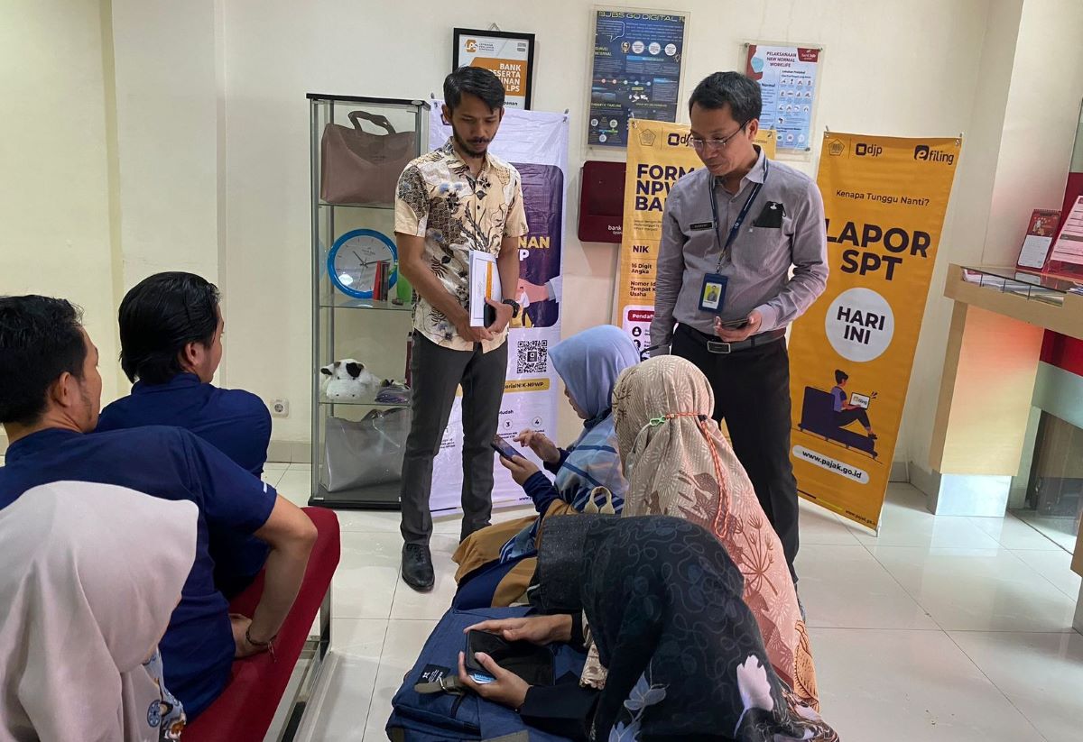 Kepala Kantor Pelayanan, Penyuluhan, dan Konsultasi Perpajakan (KP2KP) Pelabuhan Ratu Djoko Widodo blusukan memberikan asistensi pemutakhiran data mandiri Nomor Induk Kependudukan (NIK) sebagai Nomor Pokok Wajib Pajak (NPWP) melalui situs web pajak.go.id langsung kepada nasabah Bank Jabar Banten (BJB) Syariah Palabuhanratu yang saat itu hadir di ruang utama pelayanan Bank BJB Syariah Pelabuhanratu, Jalan Siliwangi Nomor 41, Palabuhanratu, Kabupaten Sukabumi (Kamis, 9/2).