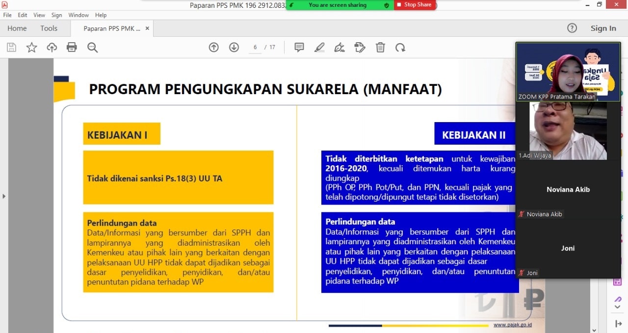 Kantor Pelayanan, Penyuluhan, dan Konsultasi Perpajakan (KP2KP) Nunukan mengagendakan Kelas Pajak khusus membahas Program Pengungkapan Sukarela (PPS) setiap hari Jumat di Kab. Nunukan (Jumat, 13/05). Tak hanya membuka kelas pajak melalui aplikasi Zoom Cloud Meeting untuk umum, KP2KP Nunukan juga mengundang wajib pajak berpotensi.