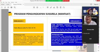 Nurista Hayuningtyas Caesareay selaku pemateri menyampaikan mengenai kebijakan yang diatur untuk pelaksanaan PPS, tata cara penyampaian Surat Penyampaian Pengungkapan Harta (SPPH) di laman pajak.go.id, hingga manfaat bagi wajib pajak yang mengikuti PPS.