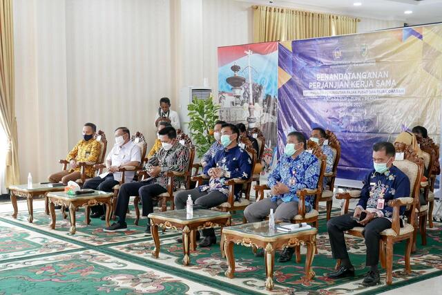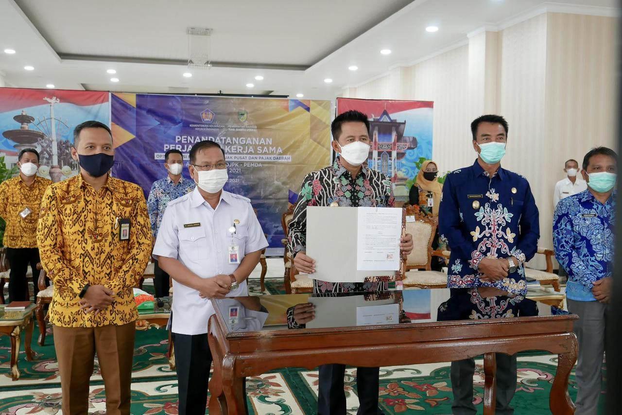 Bupati Barito Utara Nadalsyah menandatangai perjanjian kerja sama Optimalisasi Pemungutan Pajak Pusat dan Pajak Daerah antara DJP, DJPK, dan Pemda Tahap III di Rumah Jabatan Bupati Barito Utara (Rabu, 21/4).