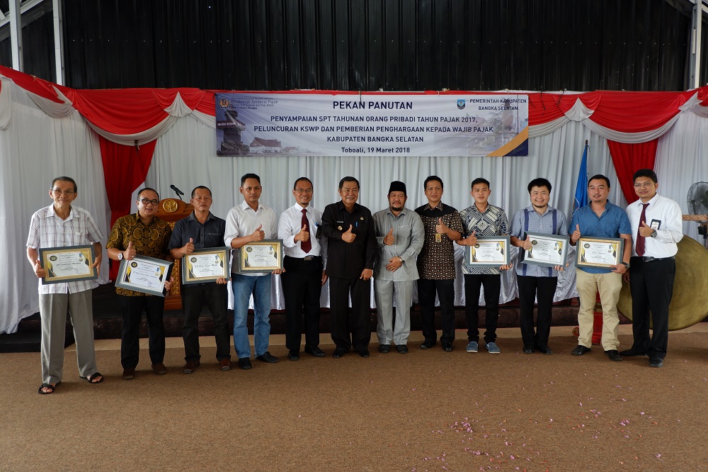 Bupati Bangka Selatan Justiar Noer, beserta jajaran Forum Komunikasi Pimpinan Daerah (Forkopimda) Bangka Selatan melakukan penyampaian SPT Tahunan secara e-Filing dalam acara Pekan Panutan Penyampaian SPT Tahunan Orang Pribadi Tahun Pajak 2017, Peluncuran KSWP dan Pemberian Penghargaan kepada Wajib Pajak Kabupaten Bangka Selatan, yang digelar oleh KPP Pratama Bangka dan KP2KP Toboali di Balai Daerah Junjung Besaoh, Bangka Selatan (Senin, 19/03).