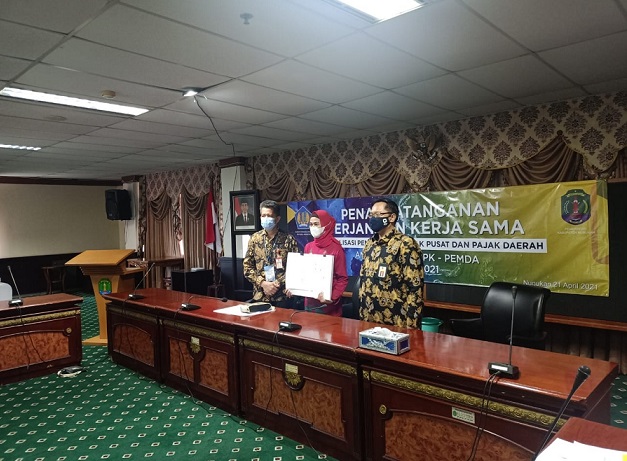 Bupati Nunukan Asmin Laura Hafid dan Kepala Kantor Pelayanan, Penyuluhan, dan Konsultasi Perpajakan (KP2KP) Nunukan Ari Saptono menandatangani perjanjian kerja sama optimalisasi pemungutan pajak pusat dan pajak daerah antara Direktorat Jenderal Pajak (DJP), Direktorat Jenderal Perimbangan Keuangan (DJPK) dan Pemerintah Daerah (Pemda) secara daring di Kantor Bupati Nunukan, Nunukan (Rabu, 21/4).