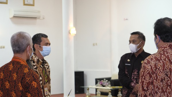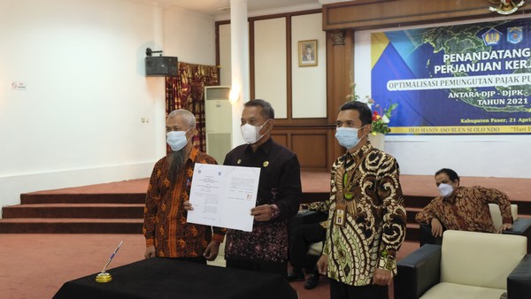 Bupati Paser Fahmi Fadli menandatangani Perjanjian Kerja Sama (PKS) antara Direktorat Jenderal Pajak (DJP), Direktorat Jenderal Perimbangan Keuangan (DJPK), Komisi Pemberantasan Korupsi (KPK), dan 84 Pemerintah Daerah (Pemda) secara daring di Pendopo Bupati Paser, Paser, Kalimantan Timur (Rabu, 21/4). Fahmi didampingi Kepala Kantor Pelayanan, Penyuluhan, dan Konsultasi Perpajakan (KP2KP) Tanah Grogot Ageng Walikito.