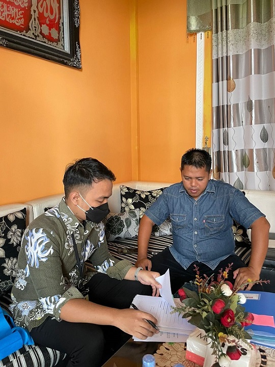 Dahlin Abednego Situmorang dan Kharisma Citra Ayuning Tyas, petugas KPP Pratama Bontang memaparkan tujuan kunjungan dan sesi tanya jawab untuk memastikan kebenaran data wajib pajak pada sistem Direktorat Jenderal Pajak dengan yang ada di lapangan.