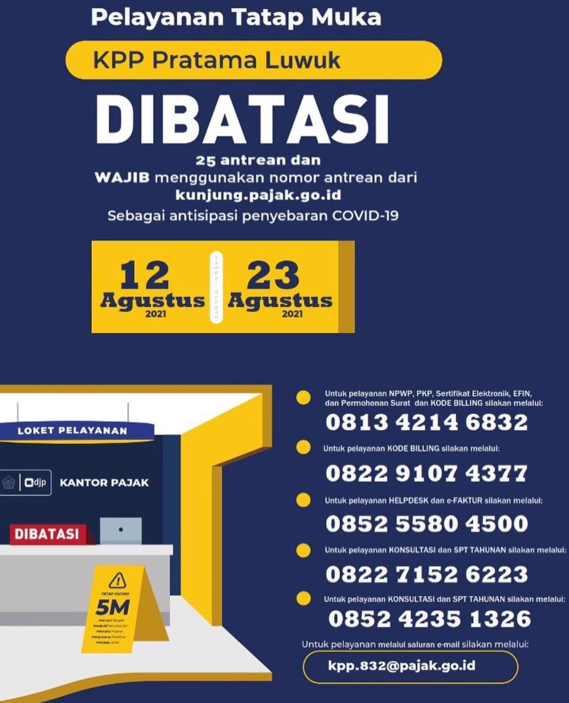 Kantor Pelayanan Pajak Pratama (KPP) Luwuk melakukan pembatasan layanan tatap muka bagi wajib pajak yang datang ke Tempat Pelayanan Terpadu, Kecamatan Luwuk, Kabupaten Banggai (Kamis, 12/8). Pembatasan layanan perpajakan melalui tatap muka dilakukan sebagai upaya untuk melakukan pencegahan penyebaran Covid-19 dengan jadwal pelaksanaan dari 12 Agustus 2021 sampai dengan 23 Agustus 2021.