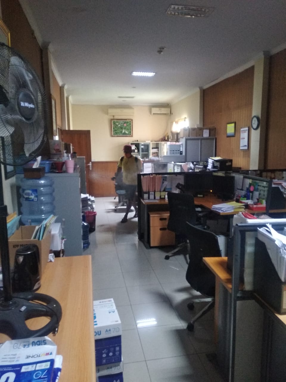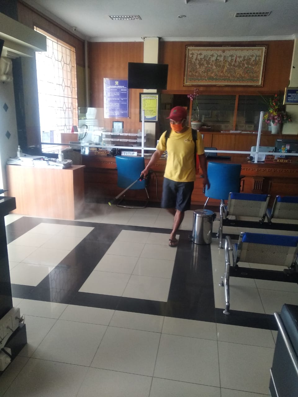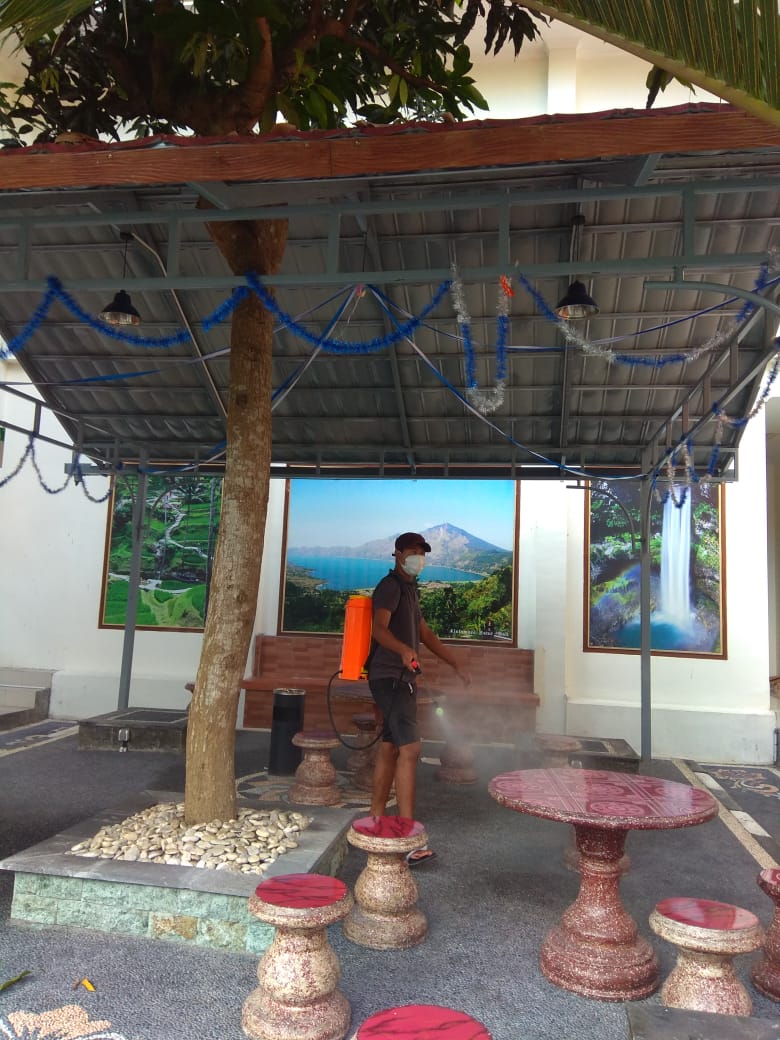 Penyemprotan disinfektan ini dilaksanakan secara rutin setiap minggu demi menjaga kebersihan setiap ruangan di kantor seperti ruang Tempat Pelayanan Terpadu (TPT), seluruh ruangan seksi, tempat ibadah, dan lain-lain. Hal ini juga dilaksanakan dalam rangka mencegah penyebaran Covid-19 yang saat ini masih melanda Indonesia.