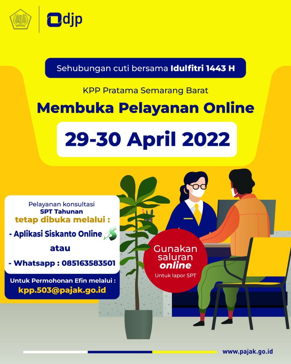 “Pelayanan perpajakan secara tatap muka di Kantor Pelayanan Pajak (KPP) Pratama Semarang Barat hanya akan dibuka sampai dengan tanggal 28 April 2022 sementara pelayanan non tatap muka terkait Konsultasi SPT Tahunan dilayani pada tanggal 29 – 30 April 2022 melalui saluran aplikasi Siskanto Online yang dapat diunduh di playstore dan melalui chat ke nomor Whatsapp “ lanjut Agapita.