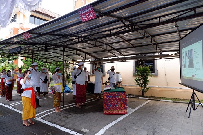 Sebelum melaksanakan upacara agama, para pegawai terlebih dahulu mengikuti upacara bendera melalui daring.