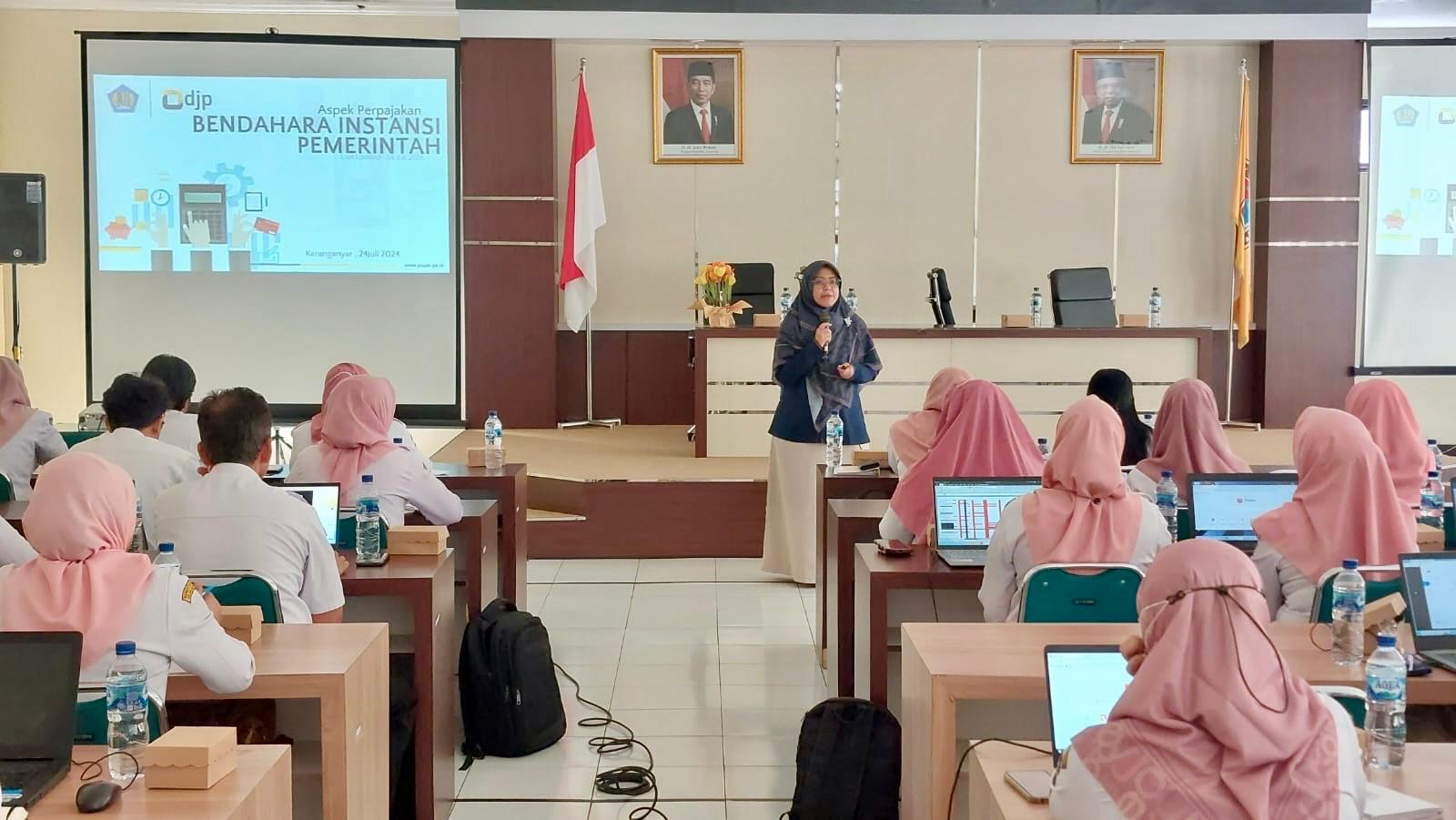 Kantor Pelayanan Pajak (KPP) Pratama Karanganyar melakukan edukasi perpajakan kepada Bendahara Dinas Kesehatan serta Bendahara Puskesmas seluruh Kabupaten Karanganyar (Rabu, 24/7). Kegiatan dilaksanakan di Aula Dinas Kesehatan Kabupaten Karanganyar yang dimulai pukul 09.00 WIB dan diakhiri pukul 12.00 WIB. Peserta yang hadir dalam kegiatan tersebut adalah sekitar 53 orang peserta.