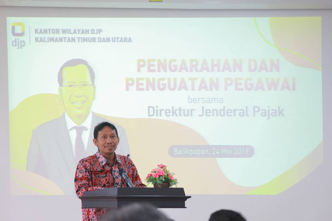 Direktur Jenderal Pajak, Robert Pakpahan memberikan pengarahan dan motivasi kepada para pegawai di Aula Kanwil DJP Kaltimra (Jumat, 24/5). Kegiatan ini diikuti oleh beberapa beberapa pejabat eselon 2 Kantor Pusat DJP dan seluruh Kepala Kanwil DJP se-Kalimantan beserta jajarannya.